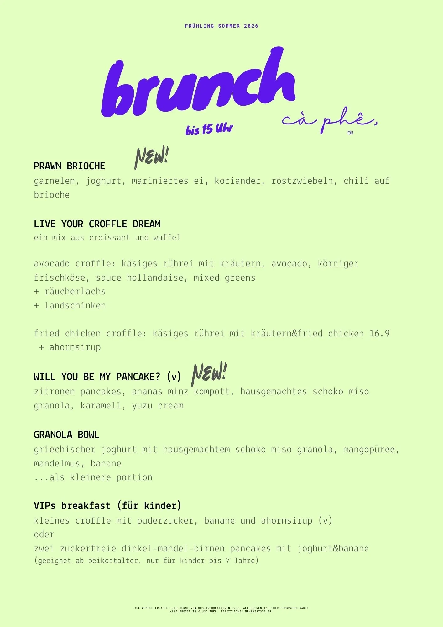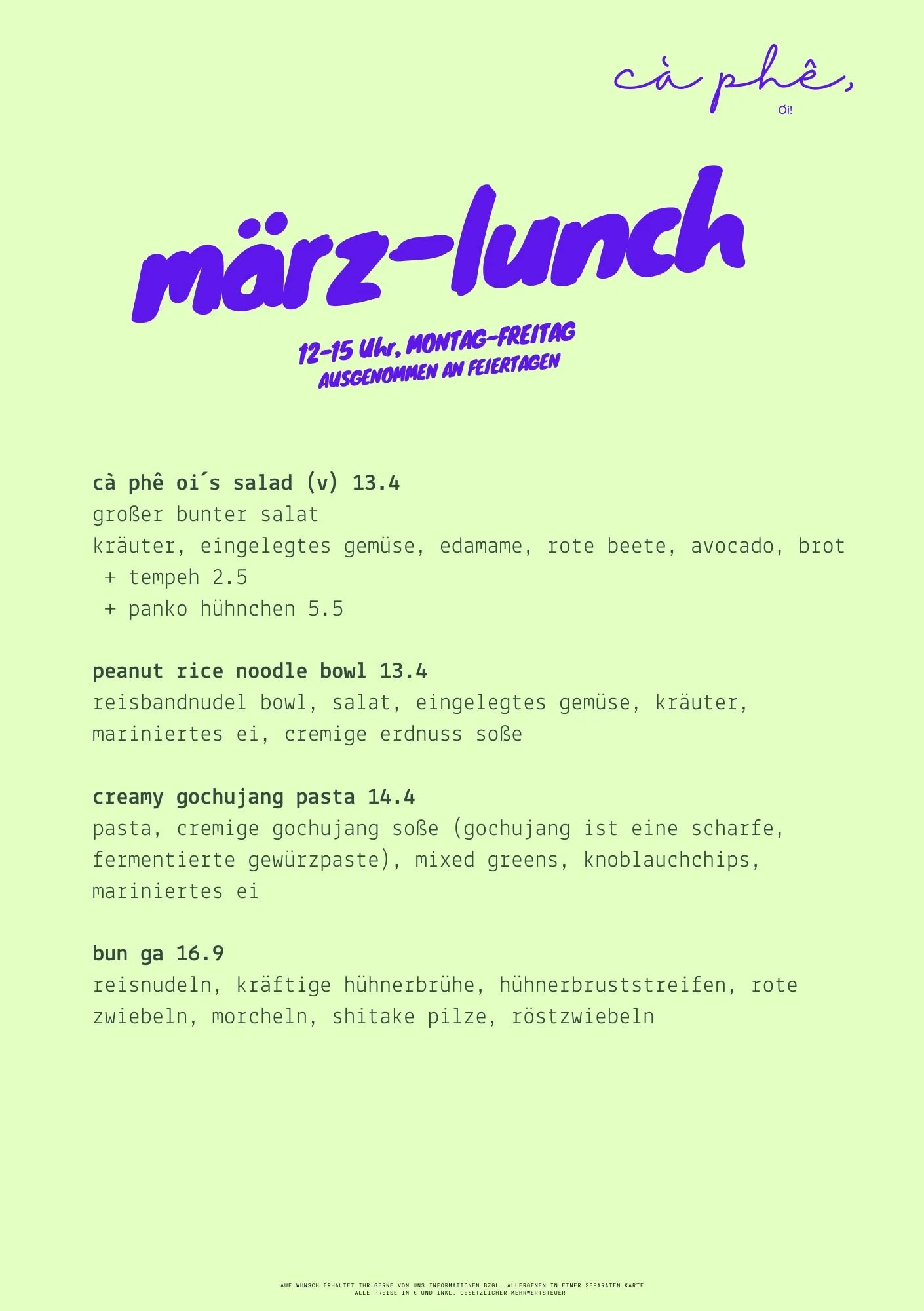 Unser Lunch Menu wird monatlich aktualisiert. Schau regelmäßig vorbei, um immer auf dem neuesten Stand zu bleiben.