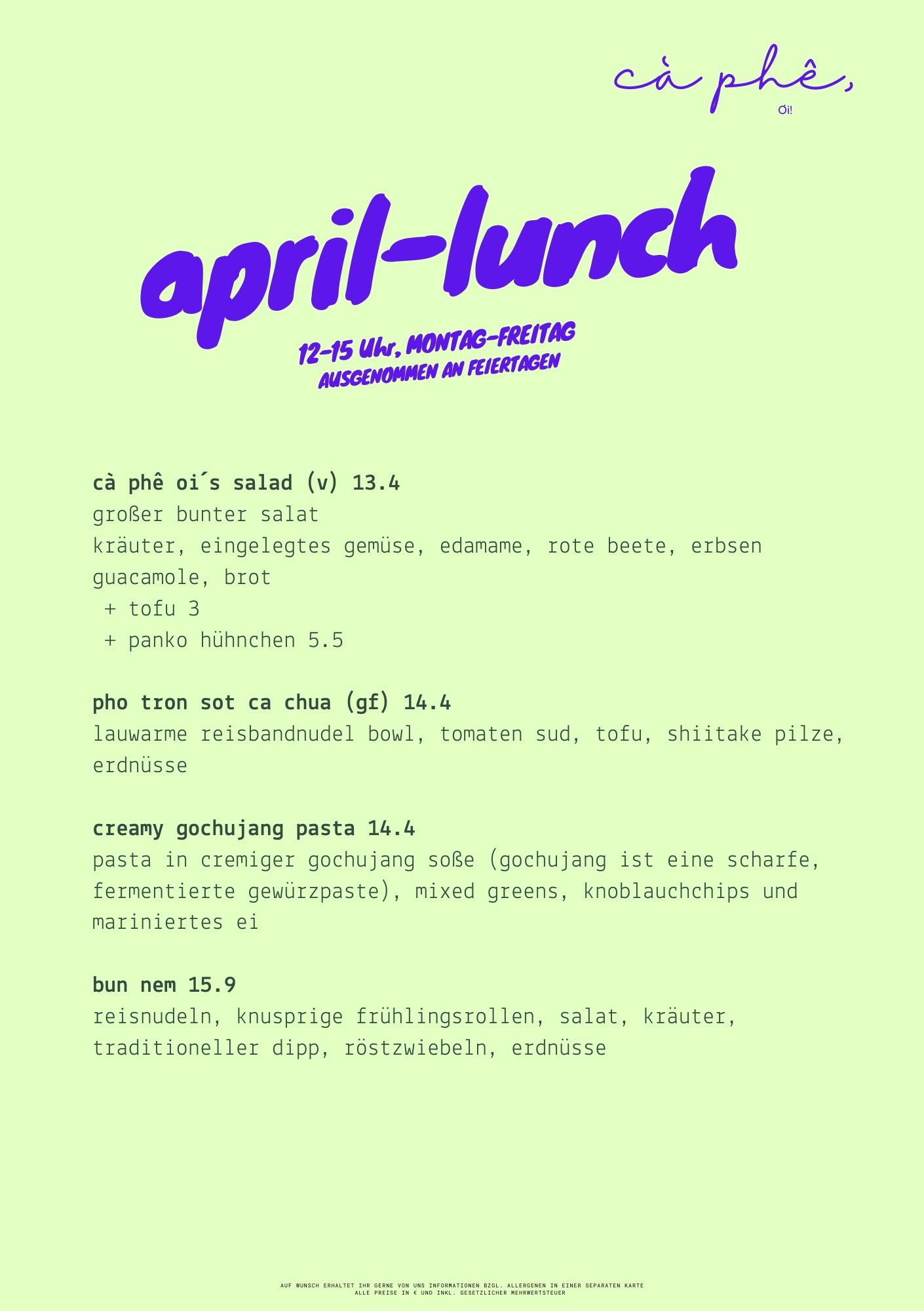 Unser Lunch Menu wird monatlich aktualisiert. Schau regelmäßig vorbei, um immer auf dem neuesten Stand zu bleiben.