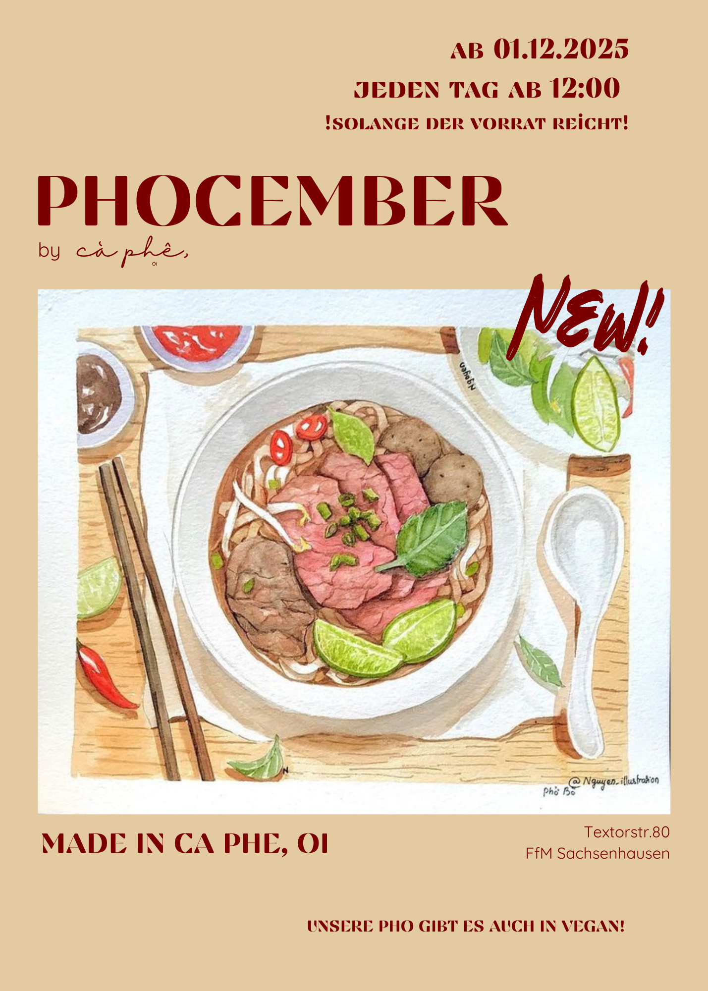 Kommt einfach vorbei, wir sind da solange der Topf Brühe hergibt. Wir servieren im Phocember „phở bò” und vegane pho jeden Tag ab 12 Uhr!